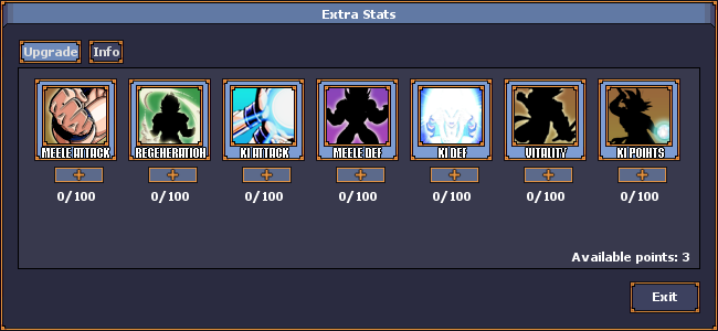 You earn three bonus points for every train points skill above 10. Train points can be trained in Hyperbolic Time Chamber - Instuction: You have to find Time Chamber room and just walk there - limits: Max skill = your_current_level/3 Before reborn: 50 train points -Stats: Melee and Dist Damage: +0,1 percent bonus damage for every point. Regeneration: +10 health and ki regeneration per second for every point. Ki Attack: +0,1 percent bonus damage for every point. Meele Def: +0,1 percent bonus meele defense for every point. Ki Def: +0,1 percent bonus ki defense for every point. Vitality: +50 extra health points for every point. Ki: +100 extra ki points for every point. | |